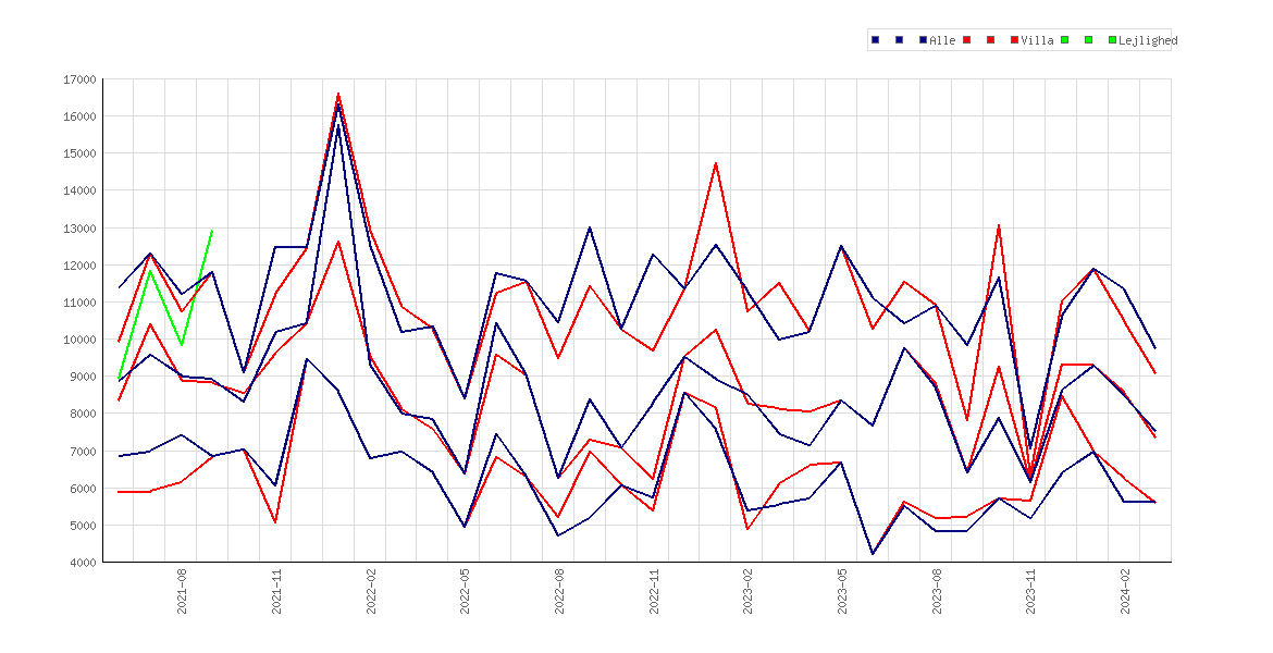 Der er 3 kurver for villaer og lejligheder, den nedre kvartil, medianen og den øvre kvartil.