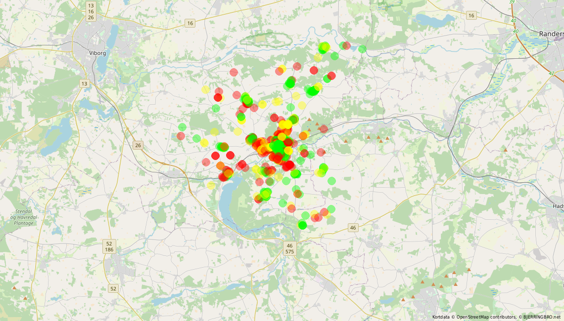Kortet viser hvor boligerne er placeret. De grønne cirkler viser boliger der er til salg og hvor m² prisen ligger i den